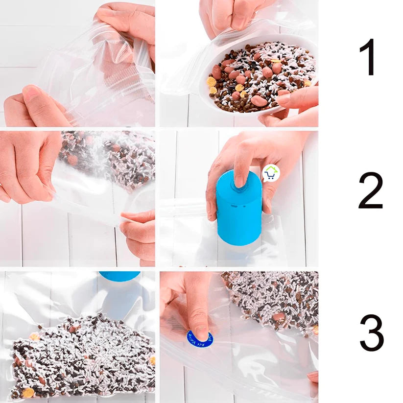 - Bolsa de sellado rápido con clip de sellado de bolsa blanca, Presione el botón blanco de la bomba electrónica. Espere unos segundos para aspirar el aire automáticamente, luego selle la bolsa herméticamente.